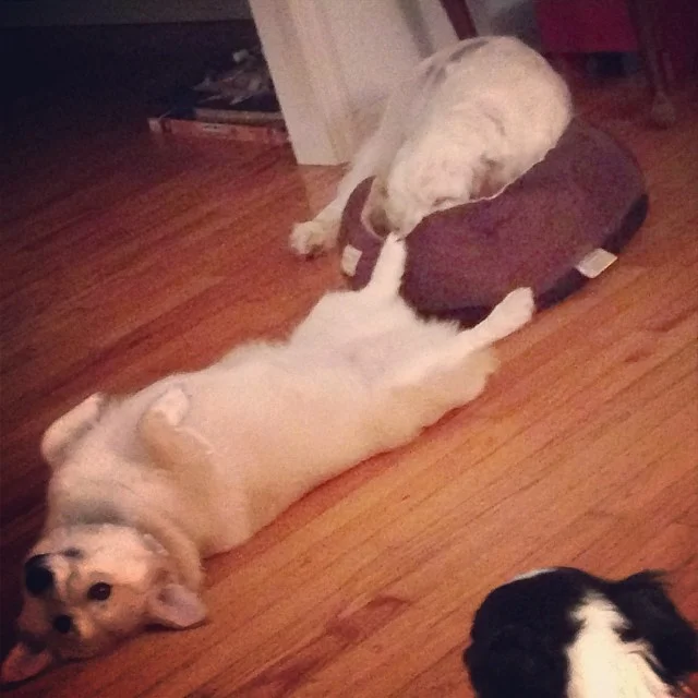 Feb 5 Written By amy dragoo Corgis are hussies. And clumbers like small beds. #livingwithclumbers livingwithclumbers amy dragoo