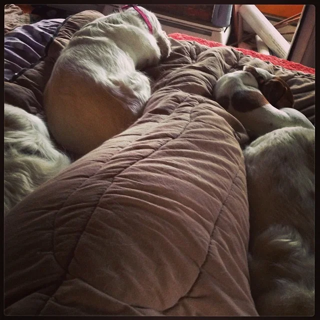 Jan 25 Written By amy dragoo Four dog morning. Nobody is acknowledging my attempts to get out of bed. #livingwithclumbers livingwithclumbers amy dragoo